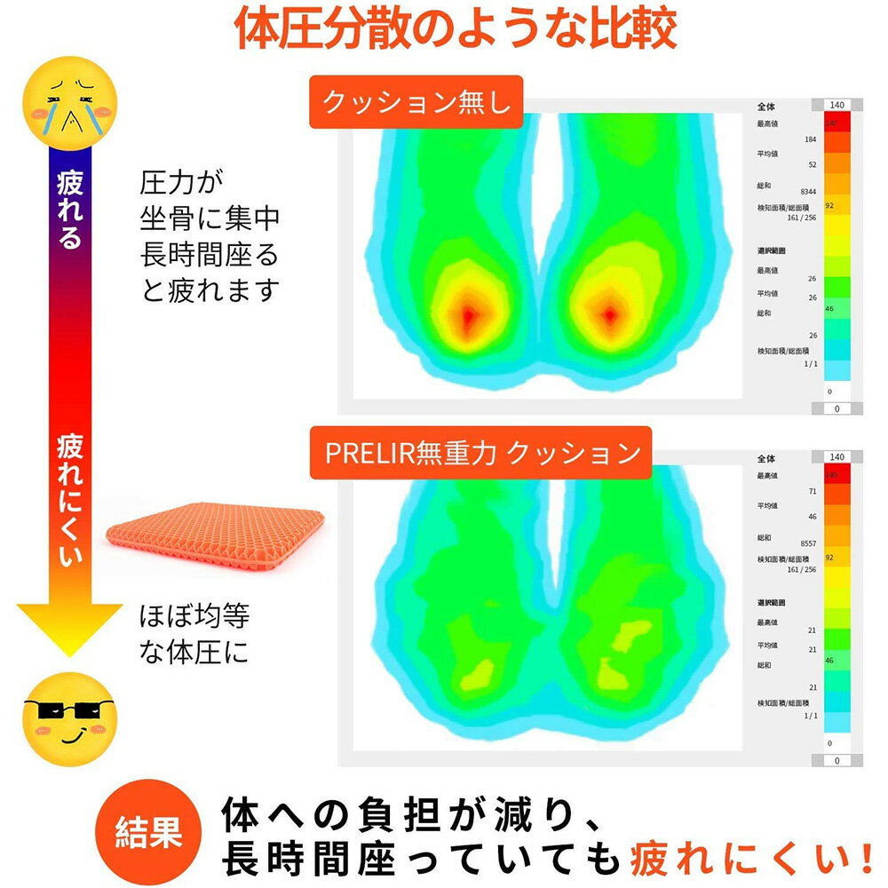 【体圧分散!無重力クッション】人間工学に基づく。